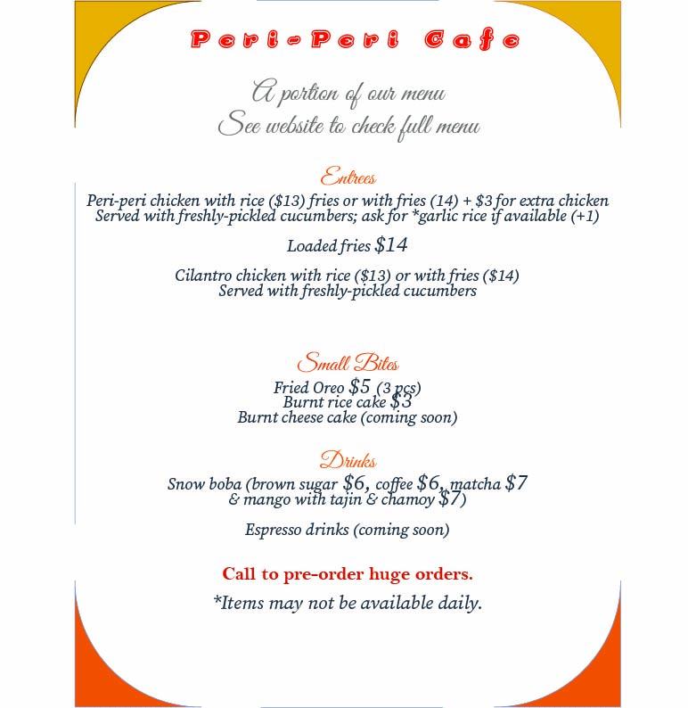 At Peri-Peri Cafe, every dish celebrates bold spices and healthier delicousness. Our menu features a chosen selection to ensure quality of ingredients and dishes. We char-grill our peri-peri chicken and do our house-made cucumber pickle daily. We use real peppers to flavor our hand-crafted sauce and to marinate our chicken. We also make our cilantro chicken from scratch and make sure you get a fresh chimichurri that goes with it.