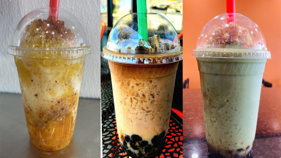 We love shaved ice. So, we have shaved ice boba - coffee, matcha, brown sugar, and mango with tajin & chamoy flavors. It is an ode to the famous halo-halo (mix-mix) drink.